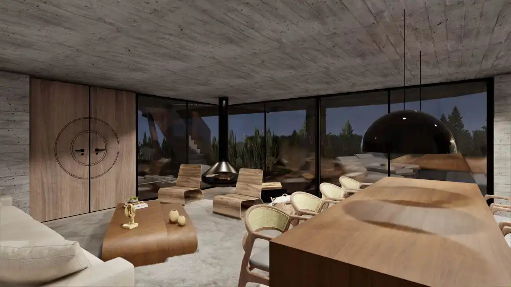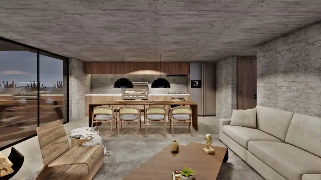 El corazón de la experiencia está en la interacción entre los espacios: mientras uno prepara un asado en la barbacoa, puede contemplar a su familia disfrutando de la piscina climatizada, con vistas únicas al atardecer.