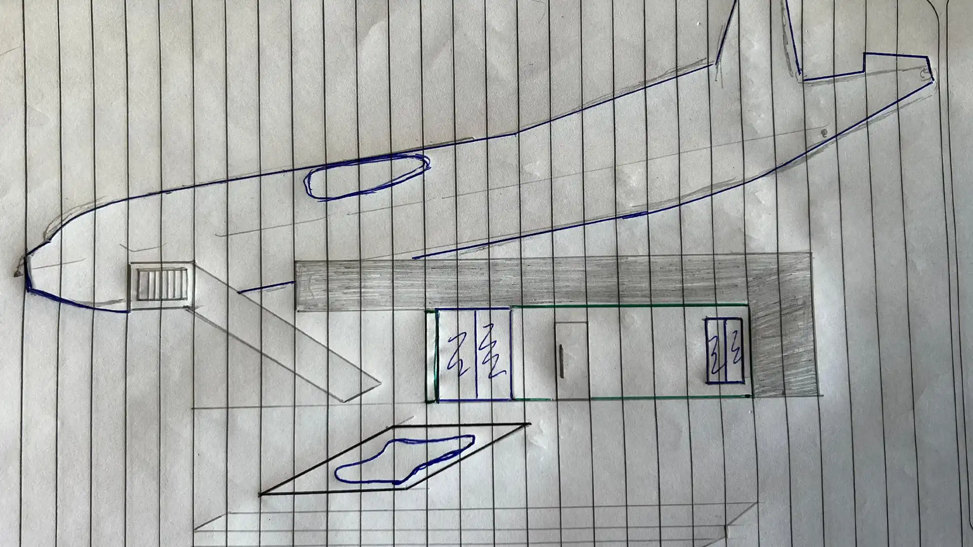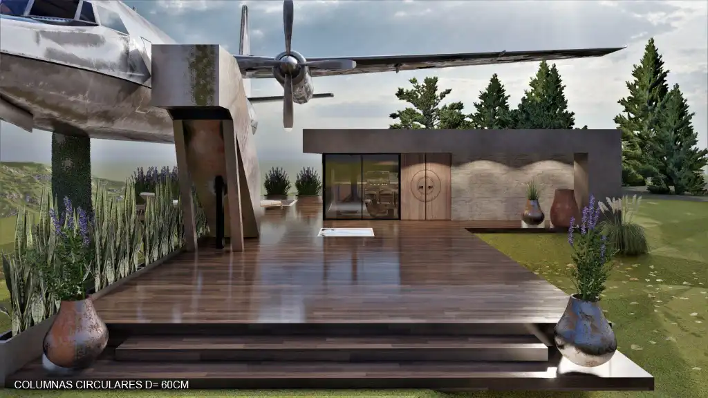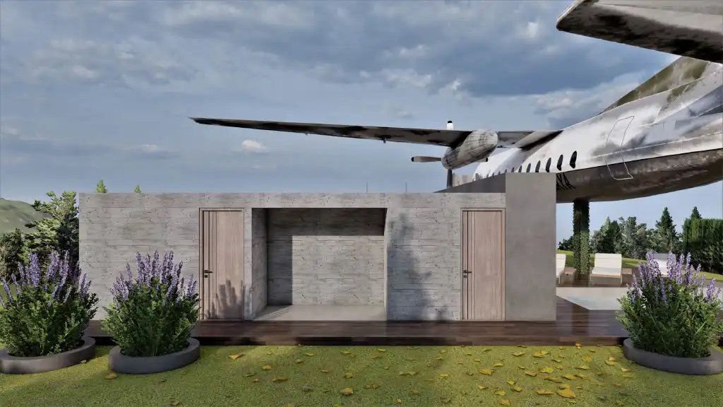 Aún no llegamos a un resultado final, pero avanzamos mucho en la estética del proyecto. Junto con el equipo de arquitectos trabajamos en los bocetos, el diseño, la composición del entorno y la ubicación de cada elemento para lograr una integración armoniosa entre el avión y el paisaje.