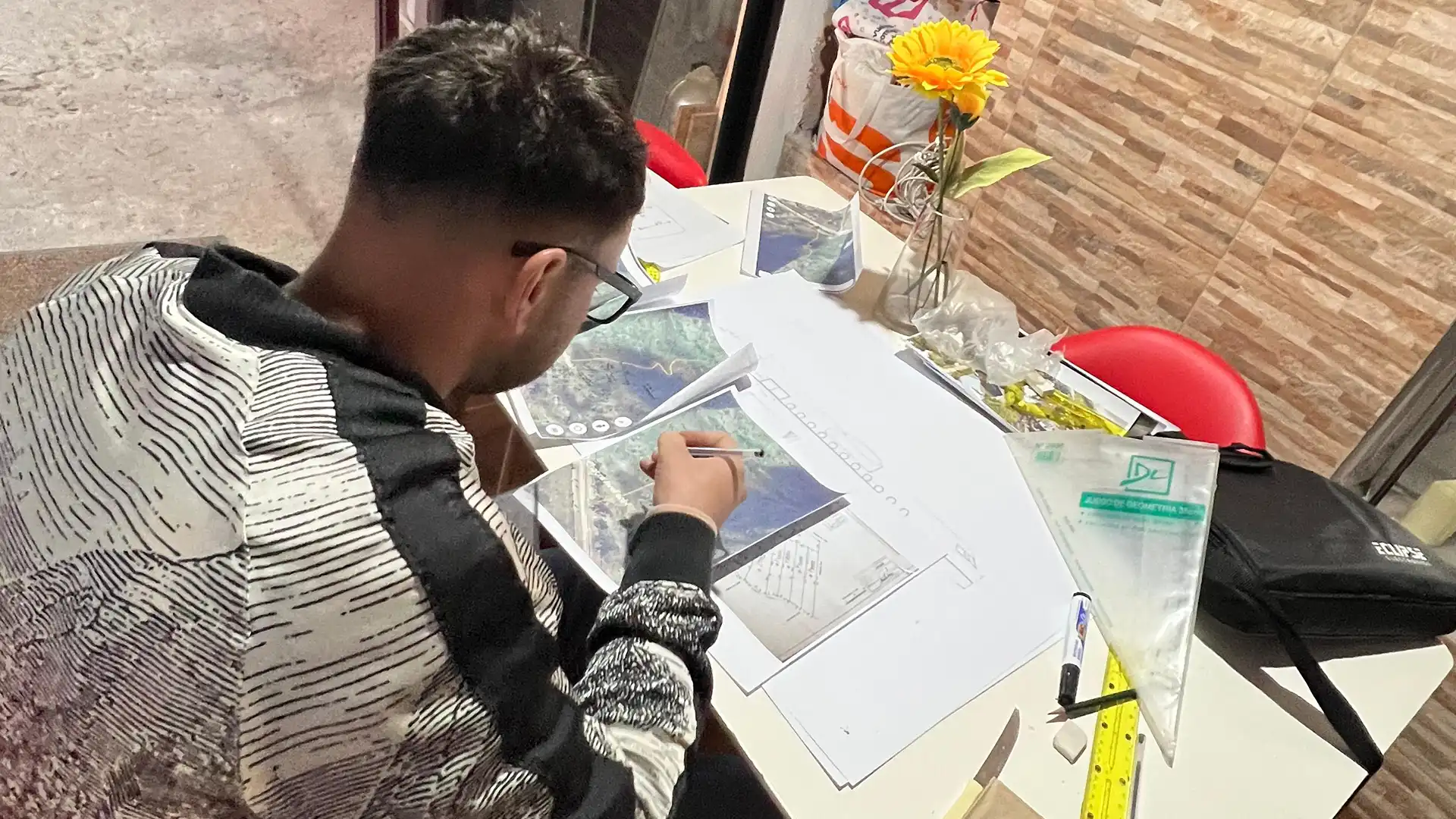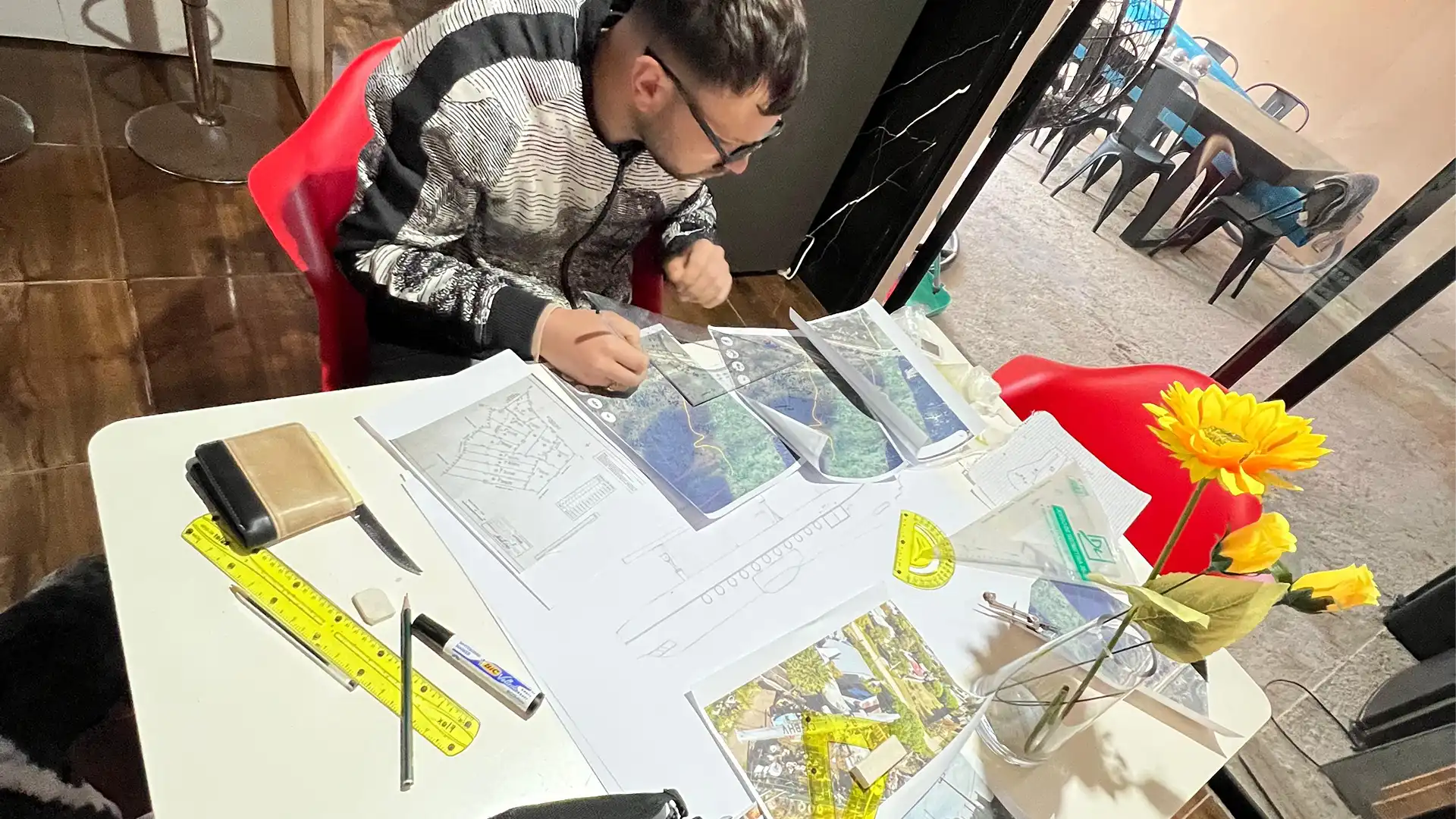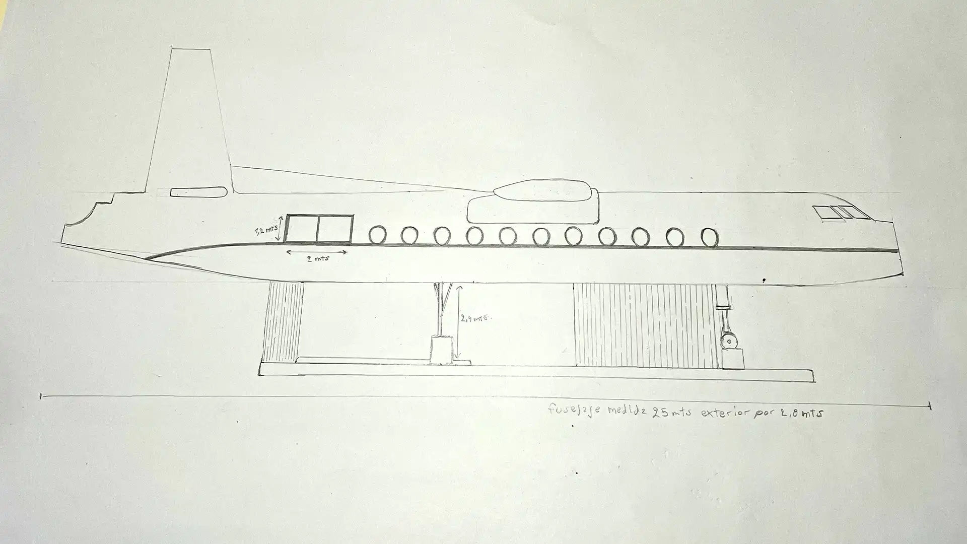 Replanteamos todo en el terreno, limpiamos la punta del cerro y ganamos metros cuadrados extra para que el avión pudiera entrar. Además, definimos la disposición general que tendría dentro del espacio.